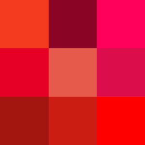 Aburelado, Acaramelado, Acarminado, Achiote, Al rojo cereza, Alazán, Aleonado, Almagre, Amaranto, Arrebol, Asalmonado, azafrán, barroso, Bermejón, Bermejizo, Bermejo, Bermellón, Brasil, Burdeos, Burelado, Buriel, Burriel, Caoba, Carmín, Carmesí, Carminoso, Carrubio, Cereza, Cinzolín, Colorado, Columbino, Coral, Corinto, Encarnadino, Encarnado, Escarlata, Fresa, Fucsia, Goles, Grana, Granate, Grancé, Grosella, Gules, Herrumbroso, Lacre, Leonado, Magenta, Nogal, Paco, púrpura, Punzó, Rodeno, Rojizo, rojo, Rosa, Rosado, Rosáceo, Rosicler, Rosmarino, Roso, rubicundo, Rubor, Rubro, Rufo, Salmón, Sepia, Sobermejo, Solferino, Tinto